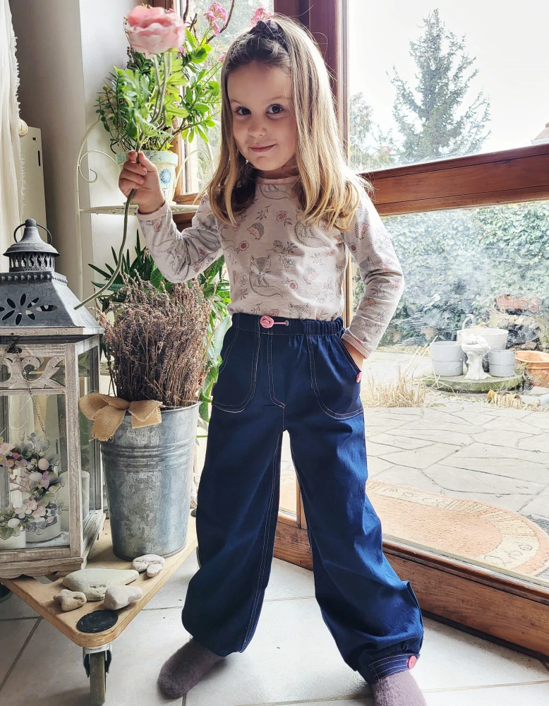 Nohavice sa vyznačujú voľným strihoma dlhými nohavicami zakončenými manžetami, čo umožňuje úplnú voľnosť pohybu počas hry. Ideálne pre dievčatá vo veku od 3 do 9 rokov, ktoré si cenia pohodlie a módny vzhľad.